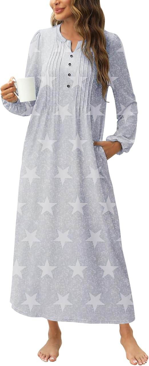 Womens Cotton Long Sleeve Nightgowns Soft Ladies Sleep Shirts V Neck Full Length Night Shirts Sleepwear with Pockets