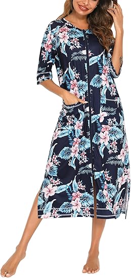 Women Robe Zipper Front House Coat 3/4 Sleeve Nightgown Full Length Ladies Lounge Dress with Pockets S-XXL