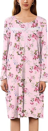 Nightgowns for Women Long Sleeve Sleepshirt Button Nightshirt Floral Sleepwear Night Dress with Pockets S-XXXL