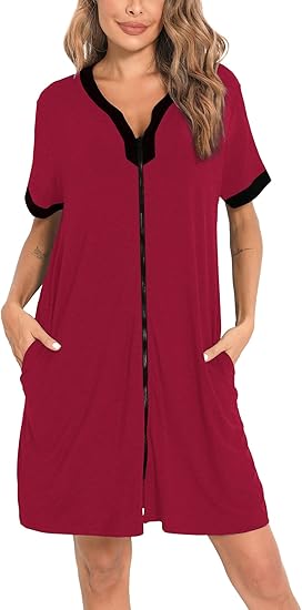 Women Zipper Front House Coat Short Sleeves Robe Zip up Bathrobes Short Nightgown with Pockets S-3XL